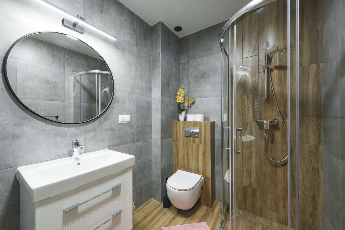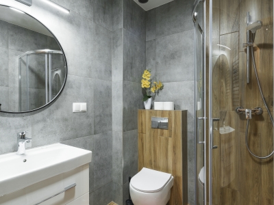• Łazienka z prysznicem, umywalką, toaletą i suszarką,