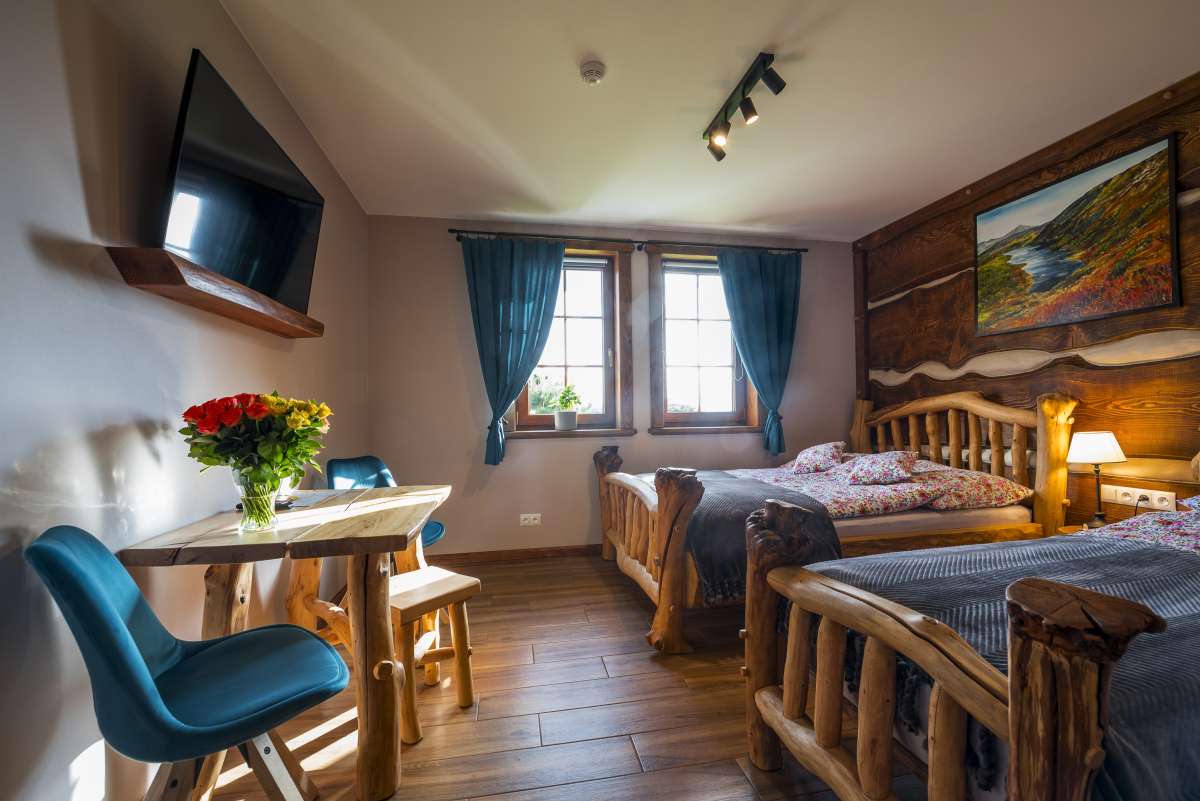 Szukasz miejsca, gdzie wypoczniesz w ciszy i przytulnej atmosferze? Nasz komfortowy pokój 3 osobowy o powierzchni 18 m² to idealna przestrzeń dla rodzin jak i grupy przyjaciół. Znajdziesz tu wygodne łóżko małżeńskie (140x200) oraz dodatkowe łóżko pojedyncze (80x200) – idealne na błogi sen po dniu pełnym górskich przygód.